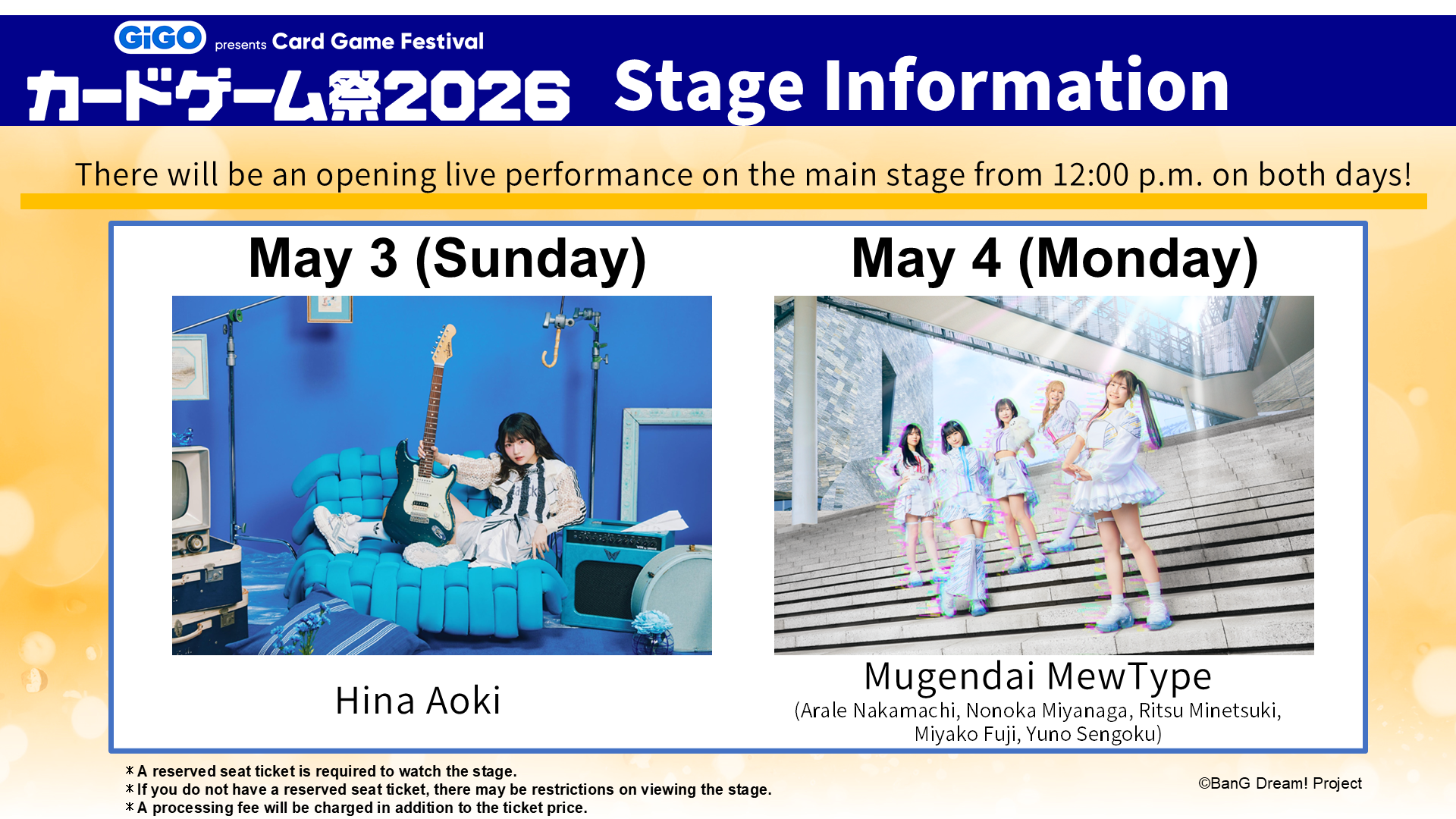 Please note that in order to watch from a reserved seat, both a Live Stage Reserved Seat Ticket and an admission ticket to Card Game Festival 2026 are required.