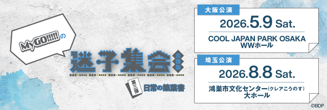 2026年5月9日(土)・COOL JAPAN PARK OSAKA WWホール(大阪)、8月8日(土)・鴻巣市文化センター(クレアこうのす) 大ホール(埼玉)にて「MyGO!!!!!の迷子集会」の出張版イベント第3弾が開催。